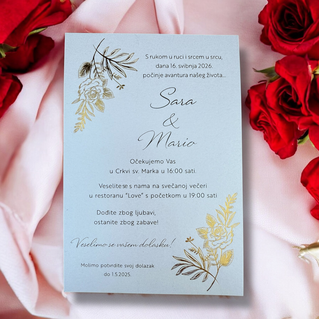 Zlatotisak (hot foil) daje pozivnicama luksuzan, sjajan dojam. Radimo na premium Heidelberg strojevima koji osiguravaju precizan i čist otisak folije, od zlatne i srebrne do specijalnih nijansi. Proces je brz, s grafičkom pripremom i vizualnom provjerom prije tiska. Pogledajte primjere i odaberite model koji najbolje pristaje vašem vizualnom identitetu. Izrađujemo i pozivnice u zlatotisku prema Vašim idejama.